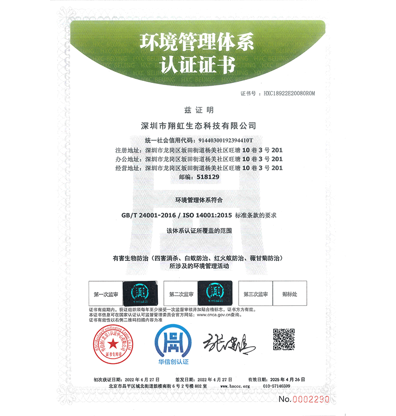 深圳市翔虹生態(tài)科技有限公司成立于1995年,是深圳最早成立的專業(yè)蟲害防治公司之一。公司發(fā)展至今獲得全國有害生物防制服務(wù)A級資質(zhì)、廣東省有害生物防制服務(wù)A級資質(zhì)、深圳市有害生物防制服務(wù)A級資質(zhì)、廣東省有害生物防制服務(wù)A級資質(zhì)、深圳市有害生物防制服務(wù)甲級資質(zhì)的單位,是中國有害生物防治協(xié)會會員、廣東省有害生物防治協(xié)會會員、深圳市有害生物防治協(xié)會理事單位,多次獲得“深圳市十佳消殺單位”榮譽。